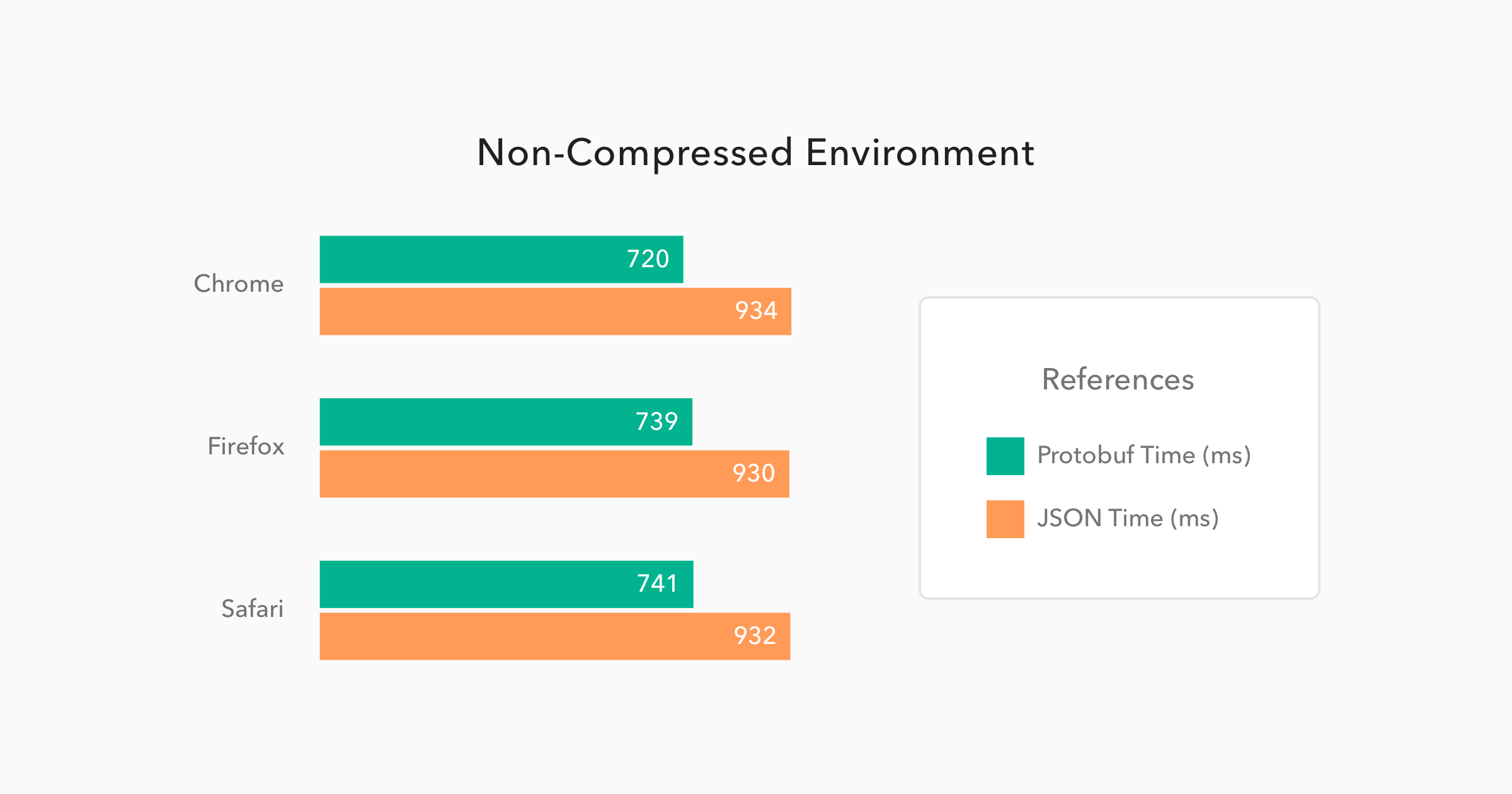 이제 protobuf 를 사용해서 전송하게된다면 기존 21 bytes(json txt) -> 5 bytes(protobuf) 로 페이로드 크기가 훨씬 작아지니 네트워크 전송량도 줄어들고, 응답속도도 빨라질 것이다. 이와 관련한 실험결과를 가져왔다. https://auth0.com/blog/beating-json-performance-with-protobuf