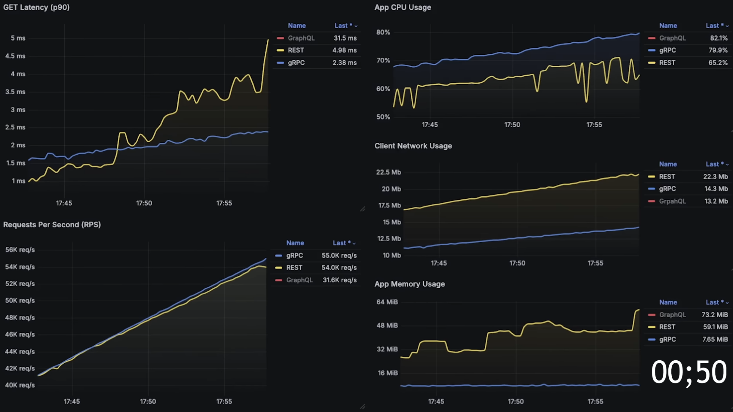 레퍼런스 들어가서 보면 진짜 인상깊다. RTS 를 천천히 늘려가면서 p90 딜레이와 cpu 사용량을 측정한 결과를 보는데 초반부에는 40% 미만인 낮은 부하조건에서 REST API 가 gRPC 보다 더 낮은 딜레이를 보여준다. 아마도 gRPC 가 내부적으로 HTTP/2 + protobuf 직렬화/역직렬화 오버헤드가 있어서 그런 것 같다.