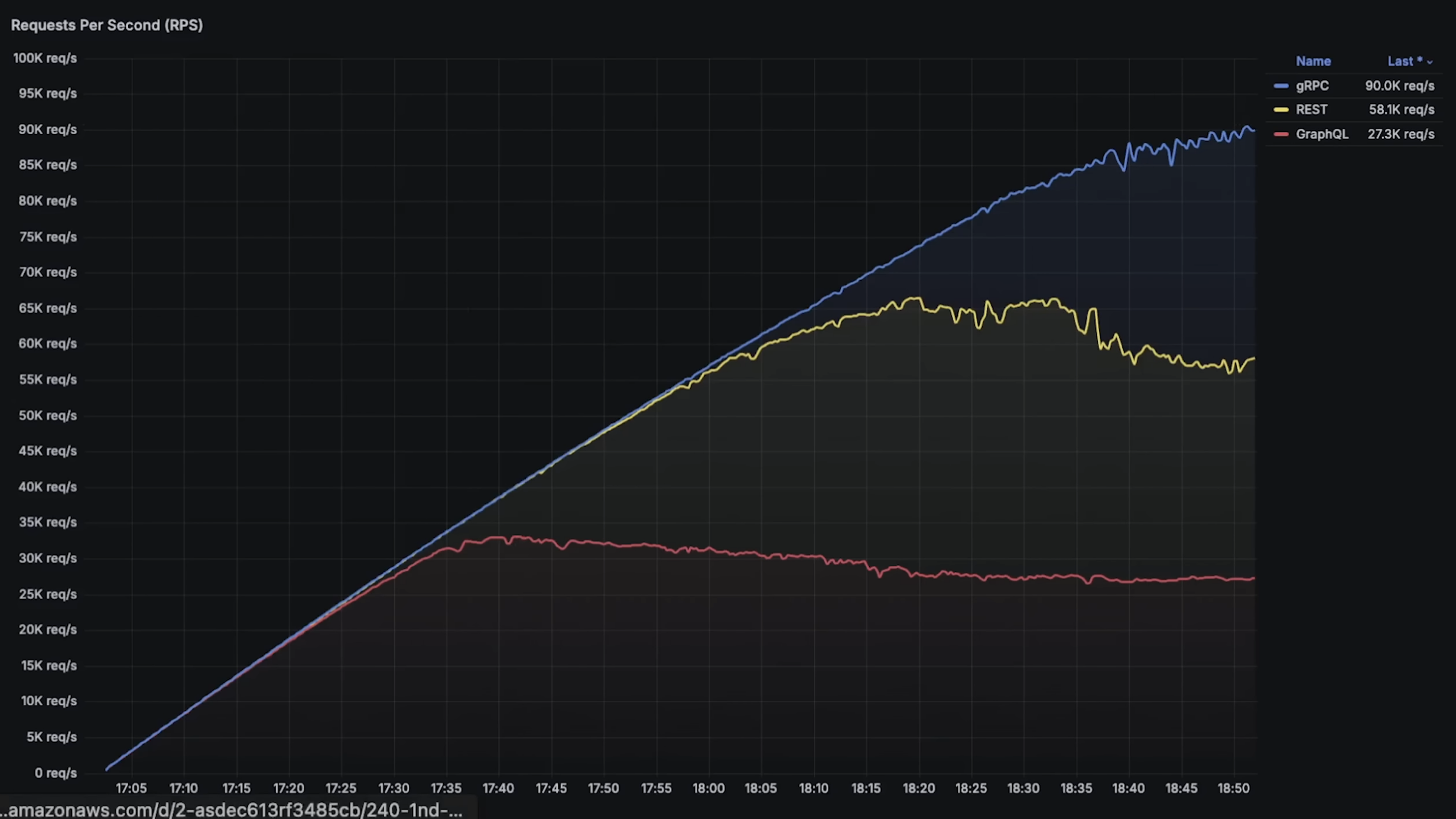 여기보면 초당 핸들링 가능한 요청 수를 비교하는 표인데 gRPC 가 압도적으로 높다. 어느 순간부터 많은 요청을 주고받을 때는 gRPC + Protobuf 조합이 아주 유리하다. 작은 수의 요청을 서로 주고받을 떄는 그냥 REST API 쓰면 됨. 만약에 진짜 매우매우 많은 수 까지 핸들링해야한다면 거의 초당 9만건 요청을 처리하고있는(REST API 에 비해 약 1.7배 이상 핸들링) gRPC 를 쓰는게 맞다.