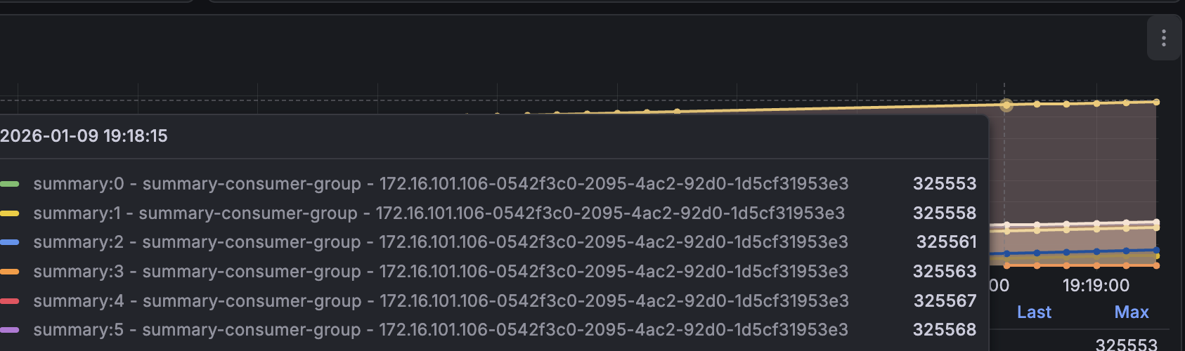 - consume 처리지연시간(consuming 하는 시점에서 현재시간과 produced 시간대 - 한 지표 쏘기)… 이거 메인 로직에 들어있으면 지연 ++ 되버려서 다른 방법이 필요할 듯 합니다