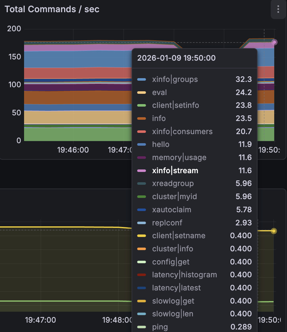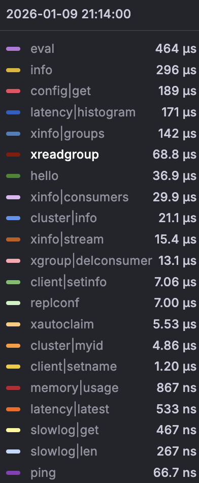 또한 모니터링을 위해 초당 xinfo 나 group 등의 정보를 초당 합쳐서 100번 이상 너무 자주호출하고 있었습니다. 하지만 xinfo 나 groups 등의 쿼리 속도는 나노 세컨트로 매우 빠르기에 크게 상관없다고 생각합니다.