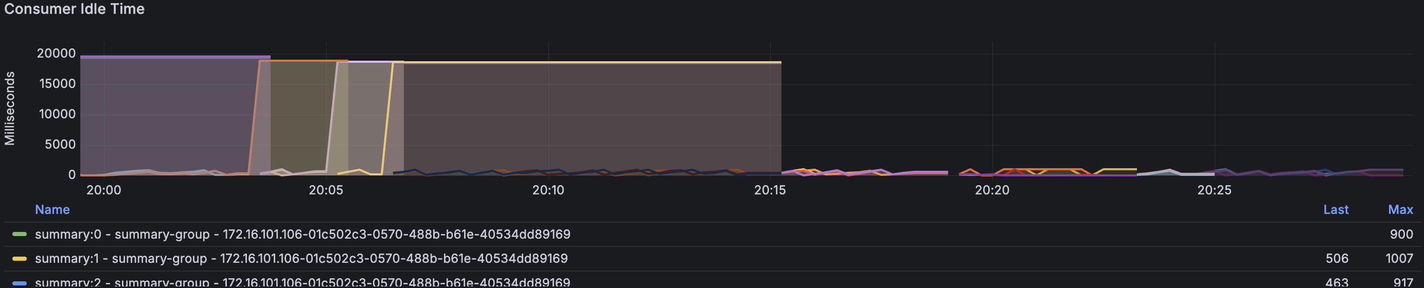 모니터링 중 이미 종료된 consumer임에도 idle time이 계속 증가하는 현상이 있었습니다. 그래서 idleTime 지난 consumer 들 제거하는 자동정리로직을 추가하였고 이후 어느 정도는 사라졌지만 그래도 남아있었습니다. 하지만 실제로 cli 쿼리해보면 정상제거 되었지만 계속해서 프로메테우스에 등장해서 이유를 확인해보니 last 상태 이후 5min 간 stale 하다고 하네요. 아래는 정상제거된 모습입니다.