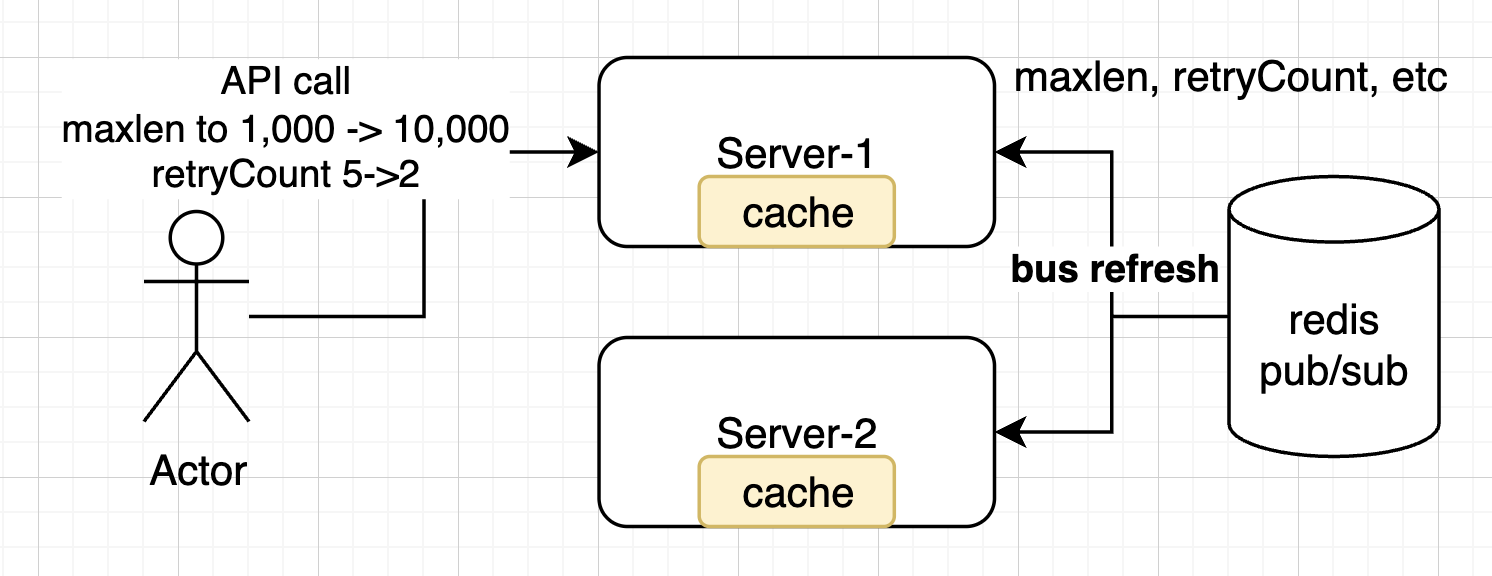 센트럴 도그마는 설정값들을 라이브에서 변경할 수 있도록 도와주는 라이브러리입니다. maxLen 이나 retrycount 와 같은 메모리에 직접적인 영향을 주는 값들을 빠르게 변경 해야 하기 떄문에 Line 센트럴 도그마에서 영감을 받아서 실시간으로 설정 값을 변경하고싶을 떄 아래와 같이 변경 스위치를 구성하였습니다. 어찌되었든 사내 인프라인 eks, redis, etc. 만으로 써야했고 추가비용은 없어야되서 아래와 같이 셋업하였습니다.