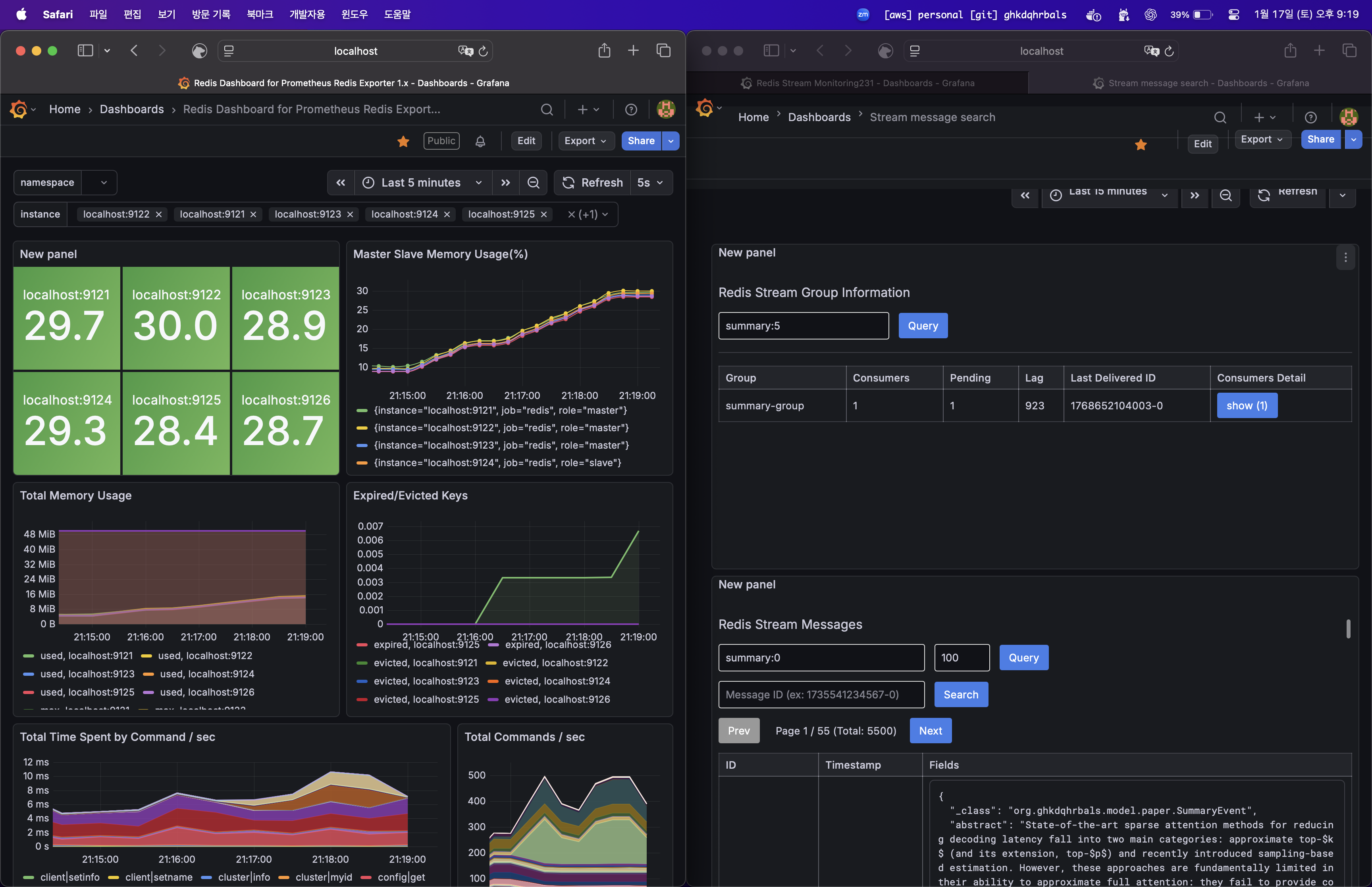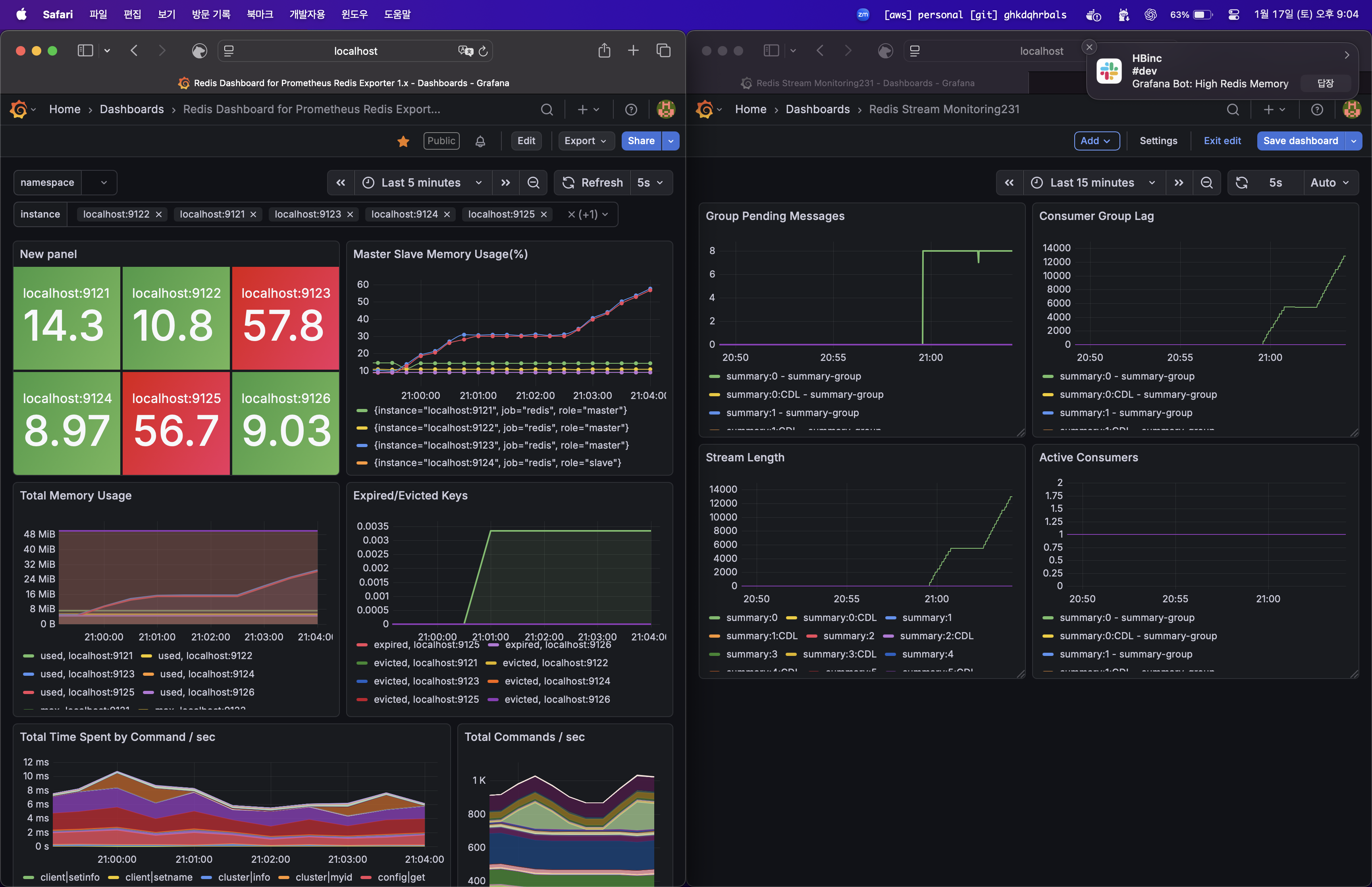 단일 파티션 로드 테스트 수행하였고 9123 master 9125 slave 에서 50% 임계값 넘어가자마자 슬랙이 도착하였습니다! 로컬 ollama ai 에 요청하고있어서 처리량이 매우매우매우 낮습니다(gamma3 500 token 요청 시 1 tps). 그래서 lag 는 줄긴 줄지만 거의 안줄어들고 있는 것을 확인할 수 있습니다.
