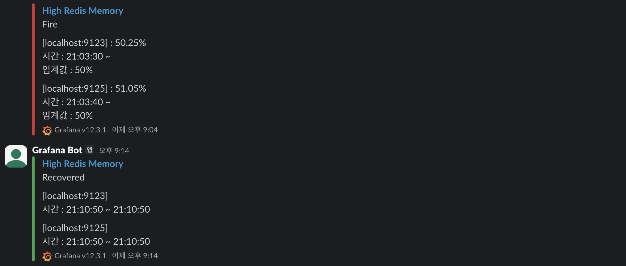 50% 임계치 초과 시 어떤 인스턴스가 초과한 지 슬랙 알림 및 recovered 또한 아래와 같이 전송.
