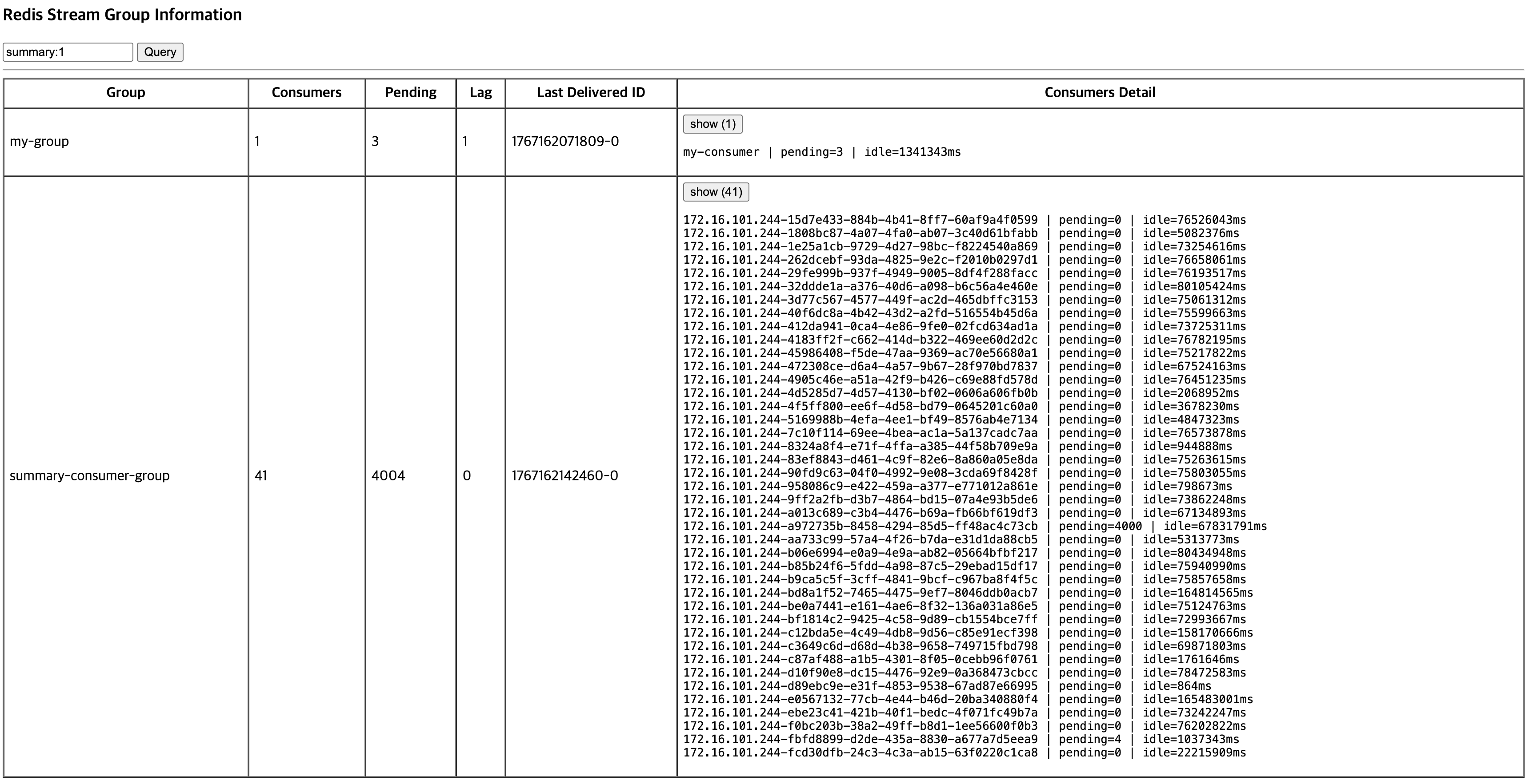 모니터링 하면서 알아냈는데 redis stream 은 consumer 자동정리를 지원하지 않습니다. 그래서 consumer 와 연결 끊어졌을 때 주기적으로 정리해주는 로직이 필요합니다. 이 부분도 추후에 개선해봐야겠네요.